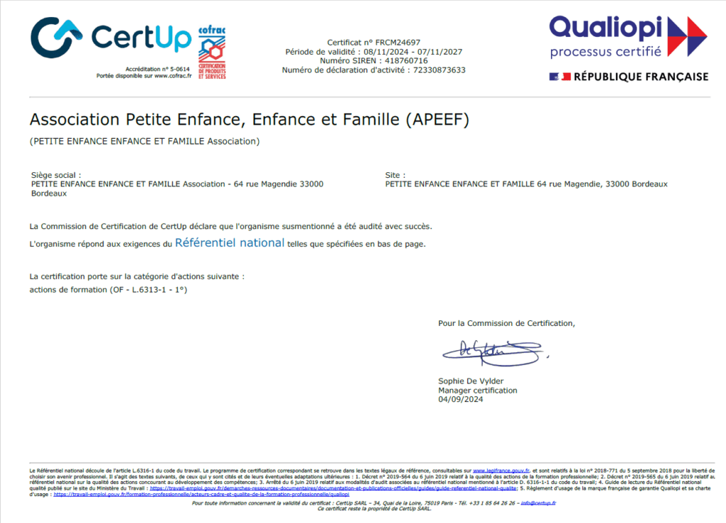 Nous élaborons des formations à la demande, vous pouvez nous contacter pour plus de renseignements par mail à accueil@apeef.com