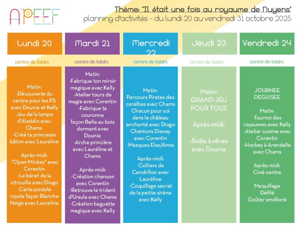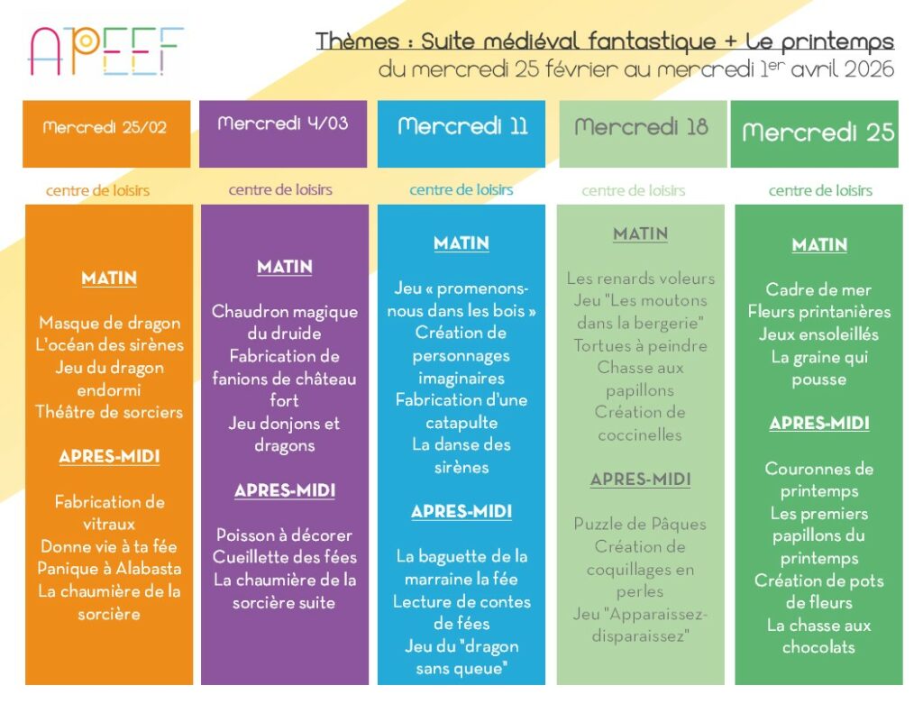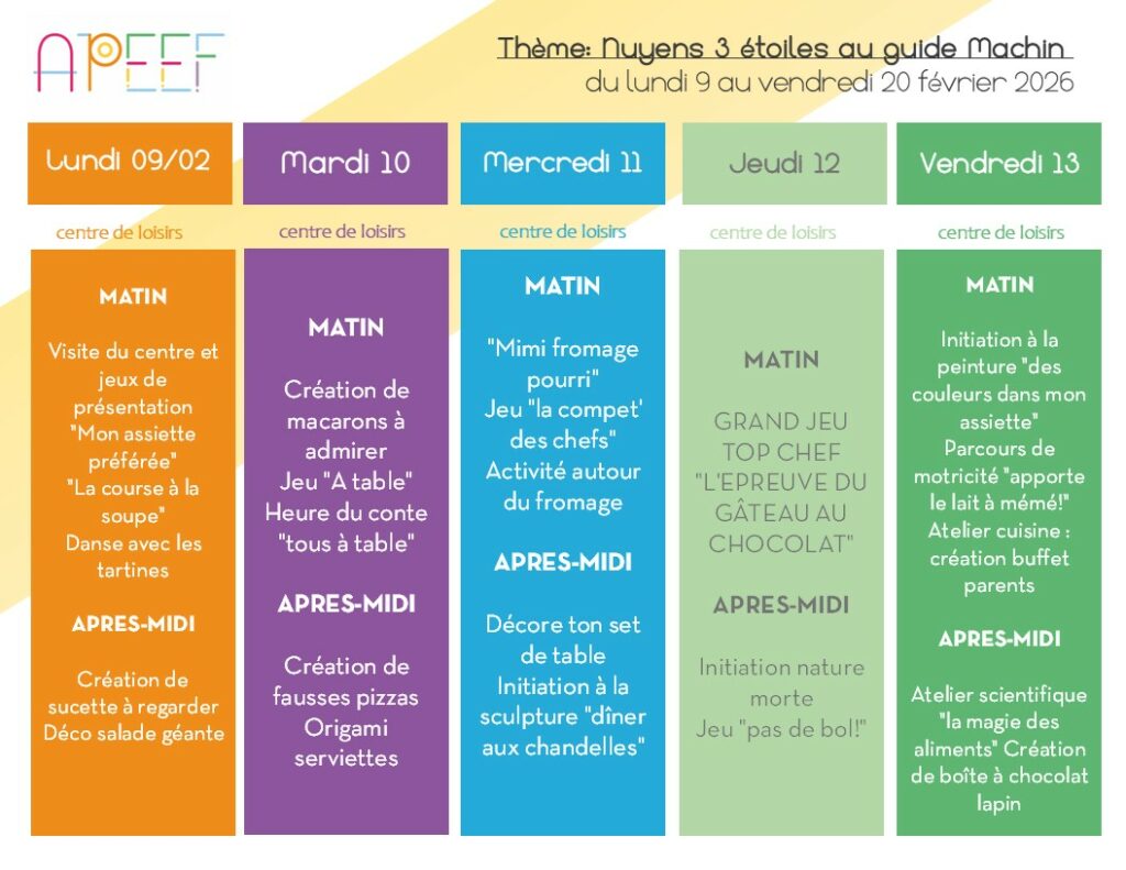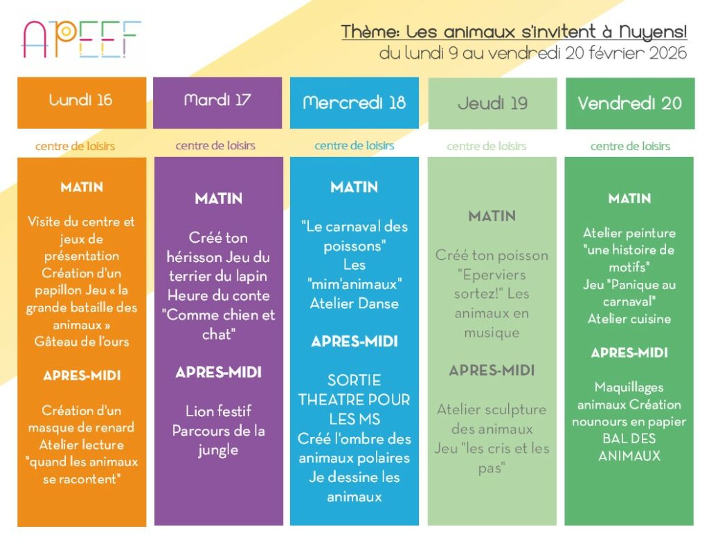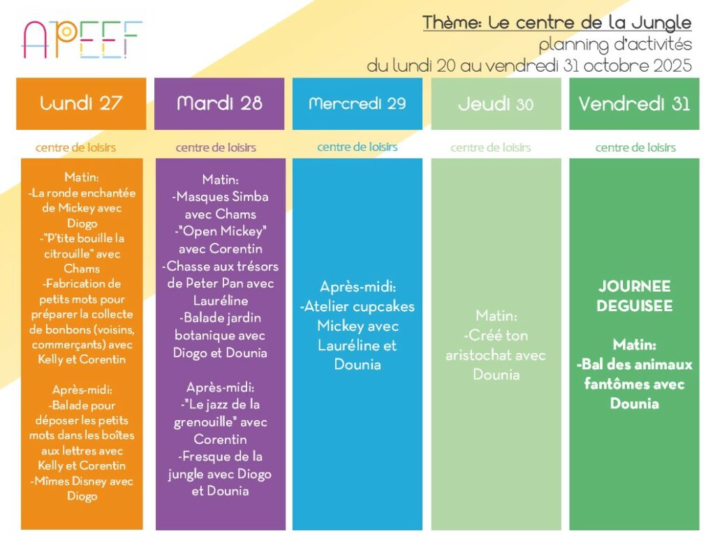 Directrice du centre de loisirs : Sarah JUAN – sarah.juan@apeef.com / 06 03 92 66 23